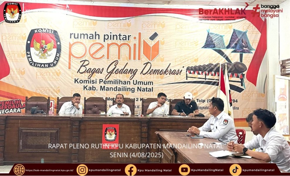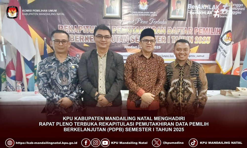 KPU Kabupaten Mandailing Natal menghadiri Rapat Pleno Terbuka Rekapitulasi Pemutakhiran Data Pemilih Berkelanjutan (PDPB) Semester I Tahun 2025 pada tanggal 4 Juli 2025 di Aula Kantor KPU Provinsi Sumatera Utara, Jl. Perintis Kemerdekaan No. 35 Gaharu, Kec. Medan Timur Kota Medan.