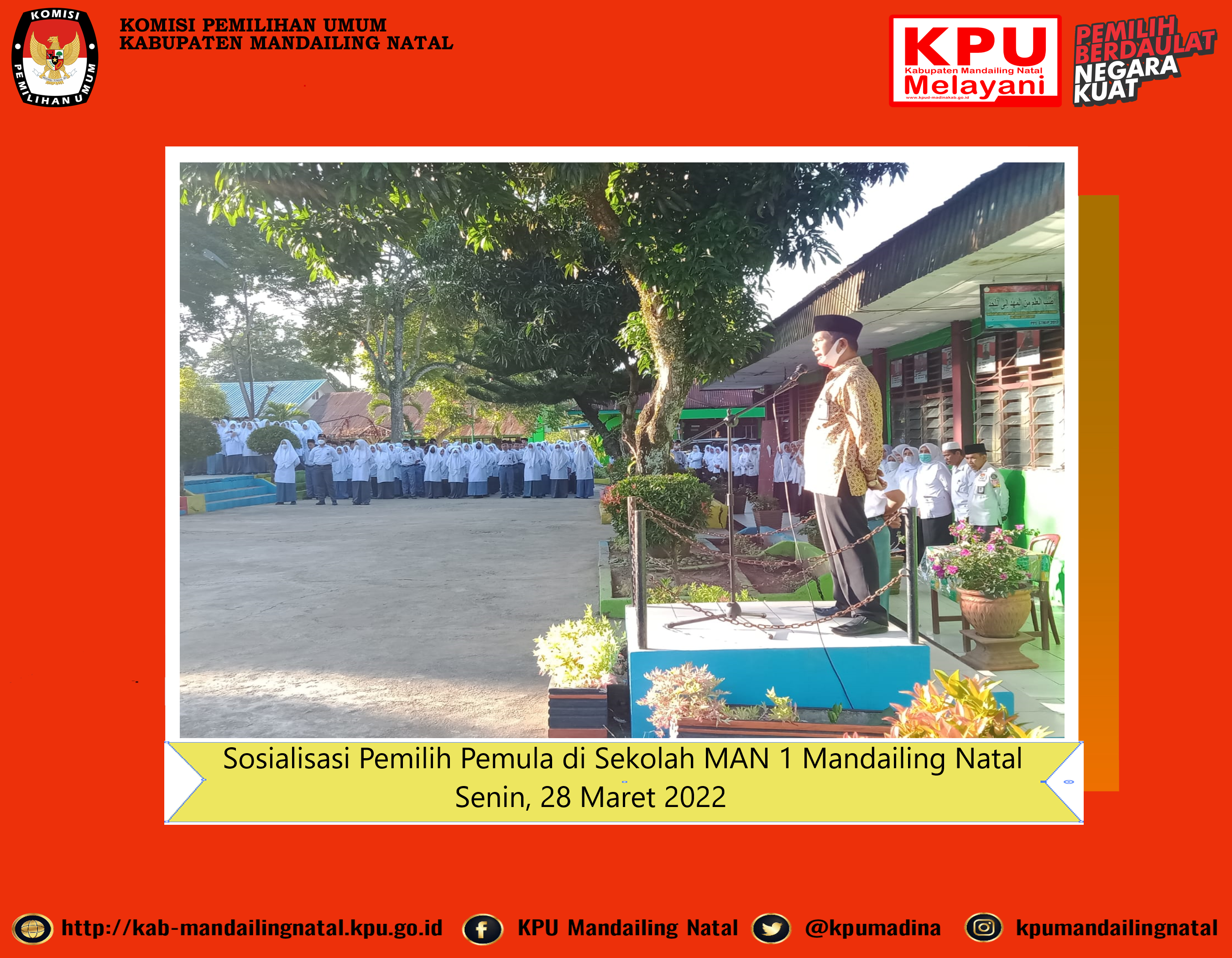 Senin (28/03), Komisi Pemilihan Umum Kabupaten Mandailing Natal melakukan Sosialisasi Pemilih Pemula di MAN 1 Mandailing Natal.  Komisioner KPU Kabupaten Mandailing Natal, Bapak Muhammad Husein Lubis Divisi Sosialisasi, SDM dan Parmasy Menjadi Pembina Upacara di  MAN 1 Mandailing Natal Beliau menyampaikan pentingnya partisipasi Pemilih Pemula dalam Pemilu serentak 2024 dan memaparkan tujuan dilaksanakan acara ini untuk mengenalkan pemilu kepada pemilih pemula agar dapat menjadi pemilih yang cerdas sehingga dapat menggunakan hak pilihnya dengan benar  Sosialisasi ini upaya untuk mensukseskan pemilu. Pemilih Pemula menjadi langkah awal untuk membentuk pelaksanaan demokrasi yang mampu mencerminkan nilai-nilai Pancasila, sebab kita ketahui bersama bahwa Pemilih Pemula nantinya akan menjadi pemilih Pemilu untuk periode berikutnya sehingga Pemilu mampu berjalan dengan baik dikarenakan pemahaman dan kesadaran yang mereka miliki akan pentingnya demokrasi yang sesuai dengan asas-asas Pancasila. Dengan demikian, maka muncullah pemilih yang cerdas dan menumbuhkan masyarakat Madani di negara Indonesia yang mampu melaksanakan kehidupan sosial dan politik sesuai dengan nilai-nilai Pancasila demi kesejahteraan hidup bermasyarakat, berbangsa dan bernegara. Komisioner KPU Kabupaten Mandailing Natal, Bapak Muhammad Husein Lubis Divisi Sosialisasi, SDM dan Parmasy beserta Staff Program dan Data juga Bersilaturahmi dengan Kepala Sekolah dan guru MAN 1 Mandailing Natal.