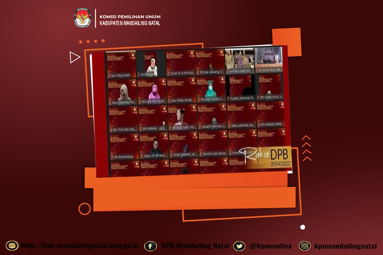 Berdasarkan Surat Undangan Ketua KPU Ri Nomor : 370/TIK.04/14/2022 Tanggal 08 April 2022, Komisioner  KPU Kabupaten Mandailing Natal Divisi Perencanaan Data dan Informasi dengan Kasubbag Data dan Informasi dan Admin/Operator Sidalih Mengikuti Rapat Koordinasi Tindak Lanjut Hasil Sinkronisasi Daftar Pemilih Berkelanjutan (DPB) sistem Informasi Administrasi Kependudukan (SIAK) yang dilaksanakan secara daring di ikuti peserta KPU Provinsi dan KPU Kabupaten/Kota Seluruh Indonesia, Sabtu (09/04/2022).