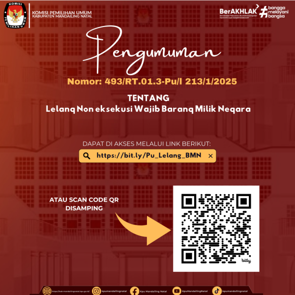 Berikut kami sampaikan Pengumuman KPU Kabupaten Mandailing Natal Nomor: 493/RT.01.3-Pu/l 213/1/2025 tentang Lelanq Non eksekusi Wajib Baranq Milik Neqara.