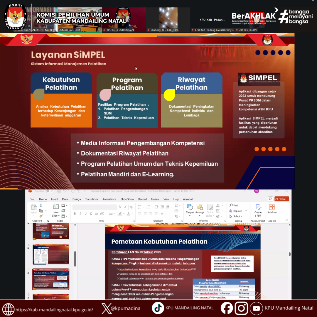 Biro Pusat Pengembangan Kompetensi Sumber Daya Manusia (PKSDM) KPU RI melaksanakan monitoring pembuatan akun SIMPEL serta pemetaan kebutuhan pelatihan bagi KPU Provinsi dan KPU Kabupaten/Kota se-Sumatera Utara melalui Zoom meeting. (18/11/25).