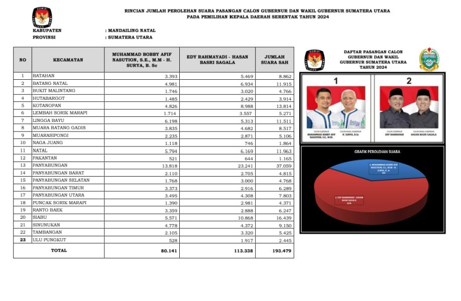 BERIKUT KAMI TAMPILKAN RINCIAN JUMLAH PEROLEHAN SUARA PASANGAN CALON GUBERNUR DAN WAKIL GUBERNUR SUMATERA UTARA PADA PEMILIHAN KEPALA DAERAH SERENTAK TAHUN 2024