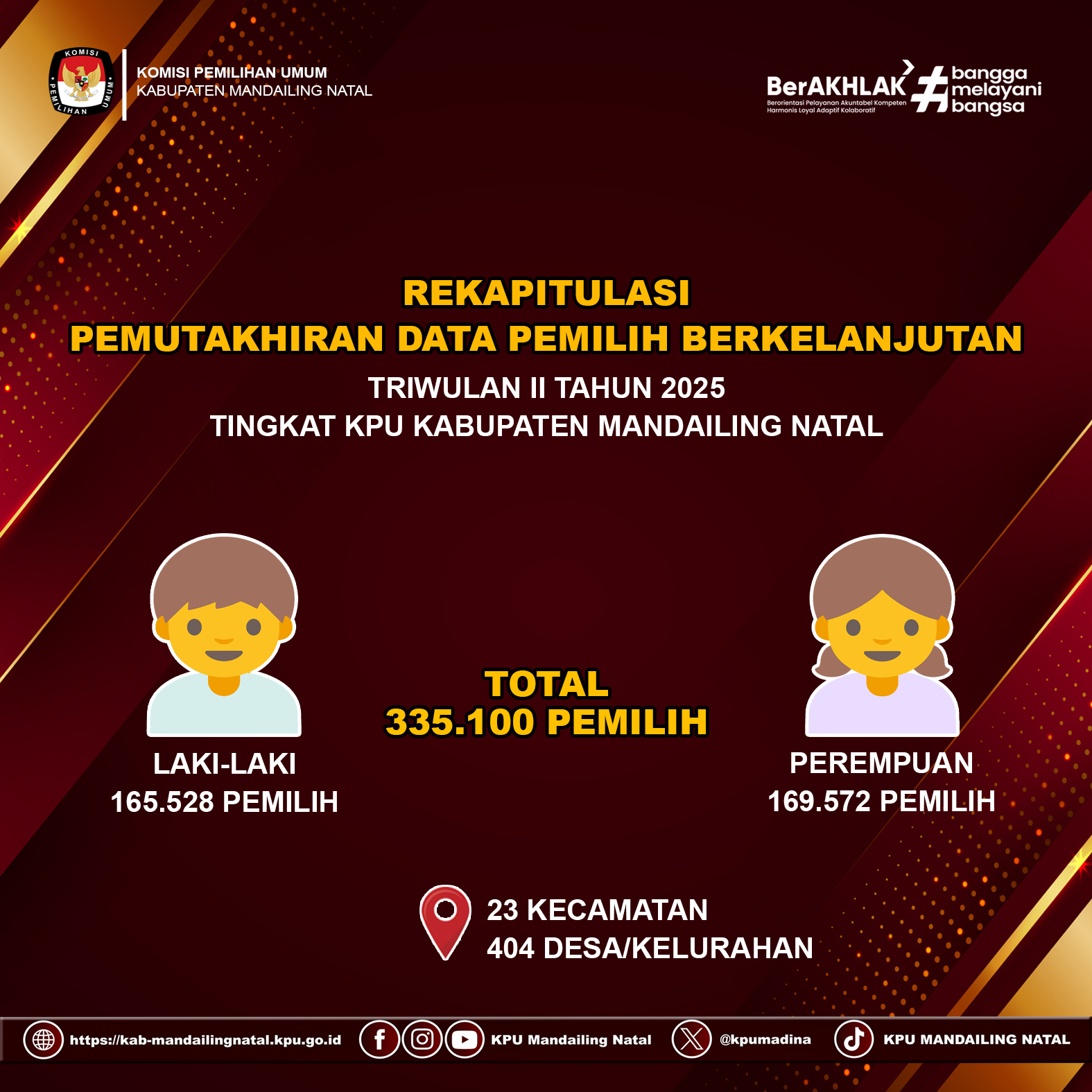 Berikut kami sampaikan Rekapitulasi Pemutakhiran Data Pemilih Berkelanjutan Triwulan II Tahun 2025 Tingkat KPU Kabupaten Mandailing Natal