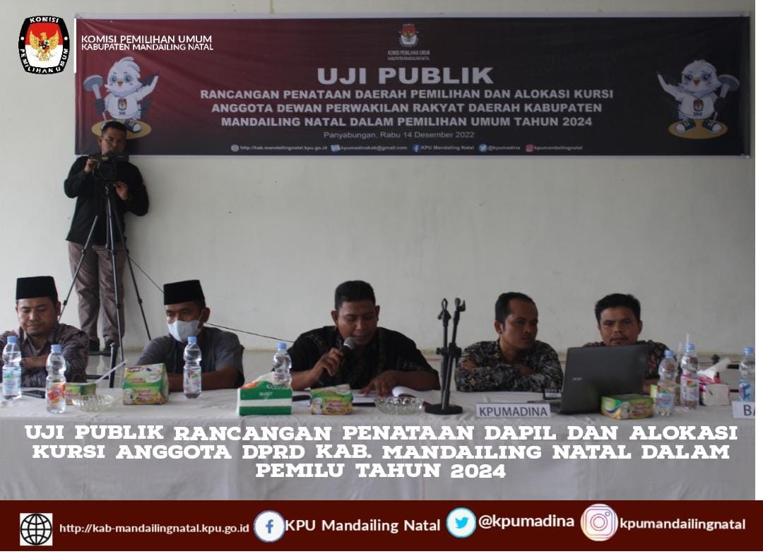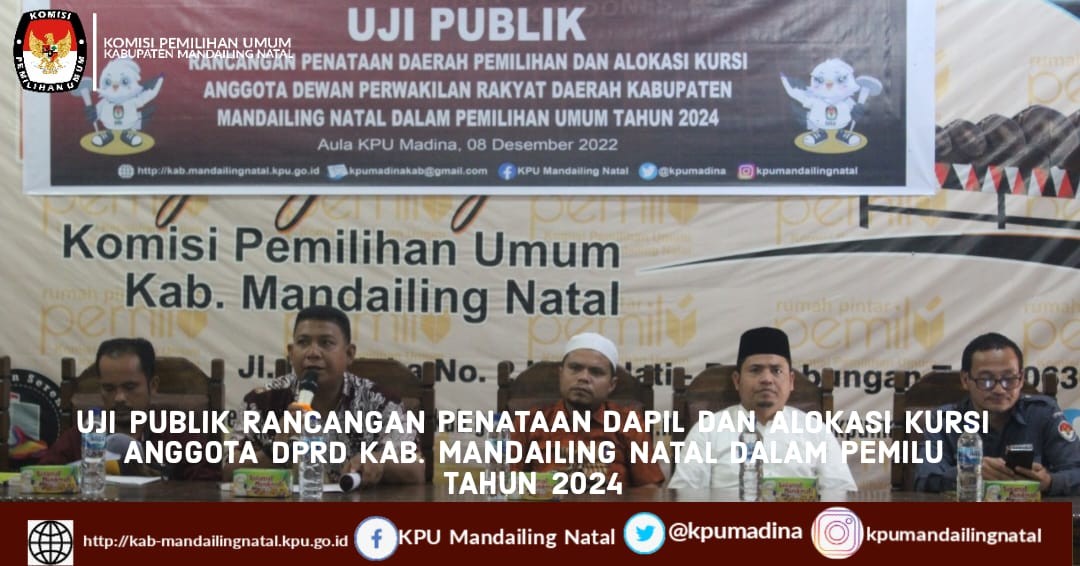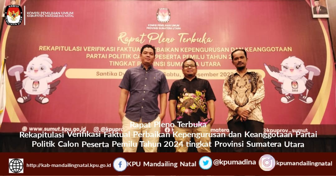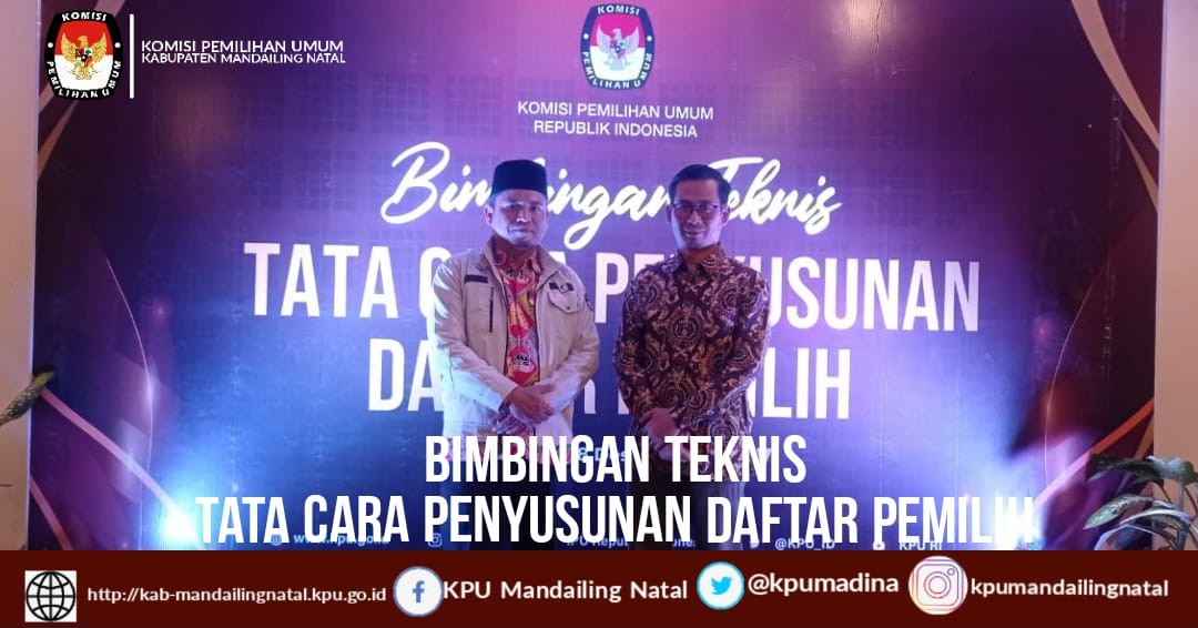Komisi Pemilihan Umum Kabupaten Mandailing Natal, mengikuti kegiatan Bimbingan Teknis Tata Cara Penyusunan Daftar Pemilih Untuk Pemilihan Umum tahun 2024 Regional I bersama 15 KPU Provinsi dan Kabupaten/Kota bertempat di Hotel Truntum Kota Padang, Sumatera Barat. Selasa-Kamis, 6-8 Desember 2022.