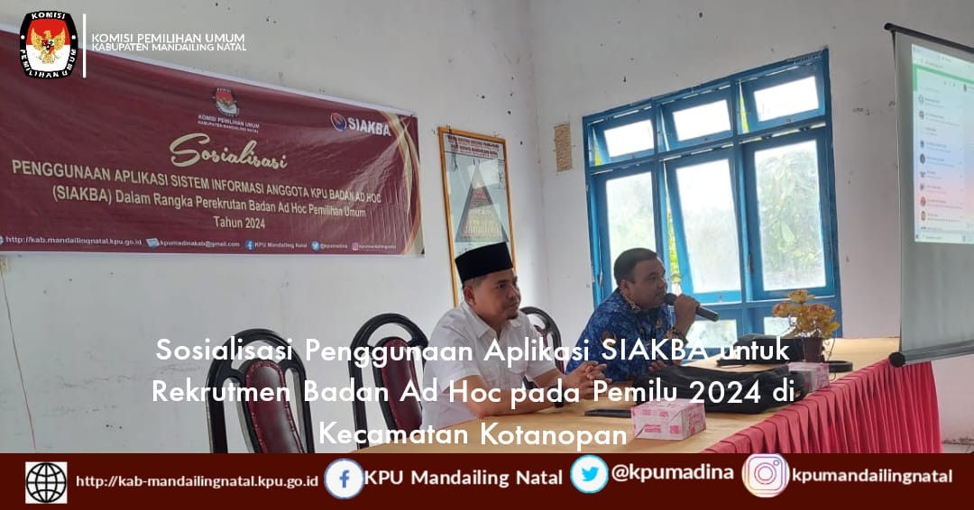 KPU Kabupaten Mandailing Natal melaksanakan Sosialisasi Penggunaan Aplikasi Sistem Informasi Anggota KPU dan Badan Adhoc (SIAKBA) dalam rangka rekrutmen Badan Adhoc pada Pemilu Serentak tahun 2024 di Aula Kantor Camat Kotanopan pada hari Kamis, 17 November 2022. Acara dibuka secara resmi oleh Bapak Pangeran Hidayat Camat Kotanopan, beliau berharap tim KPU Kabupaten Mandailing Natal dapat memberikan sosialisasi yang baik agar perekrutan Badan Adhoc Pemilu tahun 2024 berjalan dengan baik. Beliau juga berharap agar peserta mengikuti sosialisasi dengan sebaik-baiknya.
