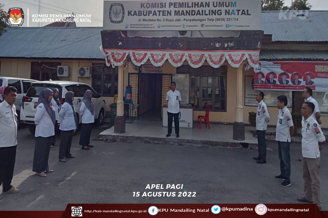 KPU Kabupaten Mandailing Natal, Senin tanggal Lima Belas bulan Agustus tahun Dua Ribu Dua Puluh Dua melaksanakan Apel Pagi di halaman Kantor Komisi Pemilihan Umum Kabupaten Mandailing Natal Jalan Merdeka No 2 Kayu Jati Panyabungan, Apel Pagi di Pimpin oleh ” Fadhillah Syarief (Ketua KPU).