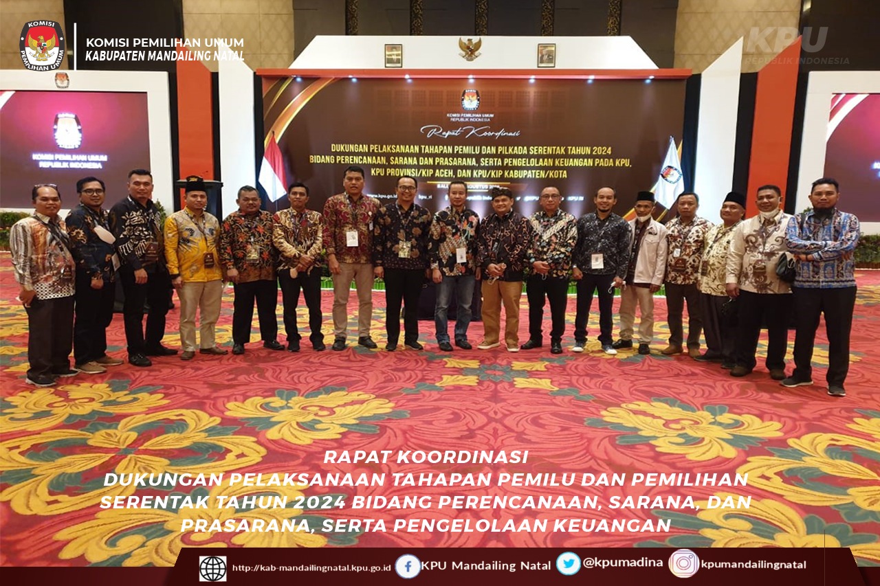 Ketua KPU Kabupaten Mandailing Natal, Anggota KPU Kabupaten Mandailing Natal Divisi Perencanaan, Data, dan Informasi, dan Kepala Sub Bagian Perencanaan, Data, dan Informasi KPU Kabupaten Mandailing Natal, serta Kepala Sub Bagian Keuangan, Umum dan Logistik KPU Kabupaten Mandailing Natal,Mengikuti Rapat Koordinasi Dukungan Pelaksanaan Tahapan Pemilu dan Pemilihan Serentak Tahun 2024 di Bidang Perencanaan, Sarana dan Prasarana, serta Pengelolaan Keuangan.