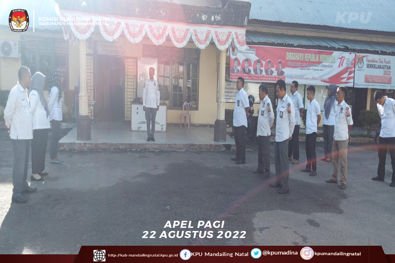 KPU Kabupaten Mandailing Natal, Senin tanggal Lima Belas bulan Agustus tahun Dua Ribu Dua Puluh Dua melaksanakan Apel Pagi di halaman Kantor Komisi Pemilihan Umum Kabupaten Mandailing Natal Jalan Merdeka No 2 Kayu Jati Panyabungan, Apel Pagi di Pimpin oleh ” Fadhillah Syarief (Ketua KPU).