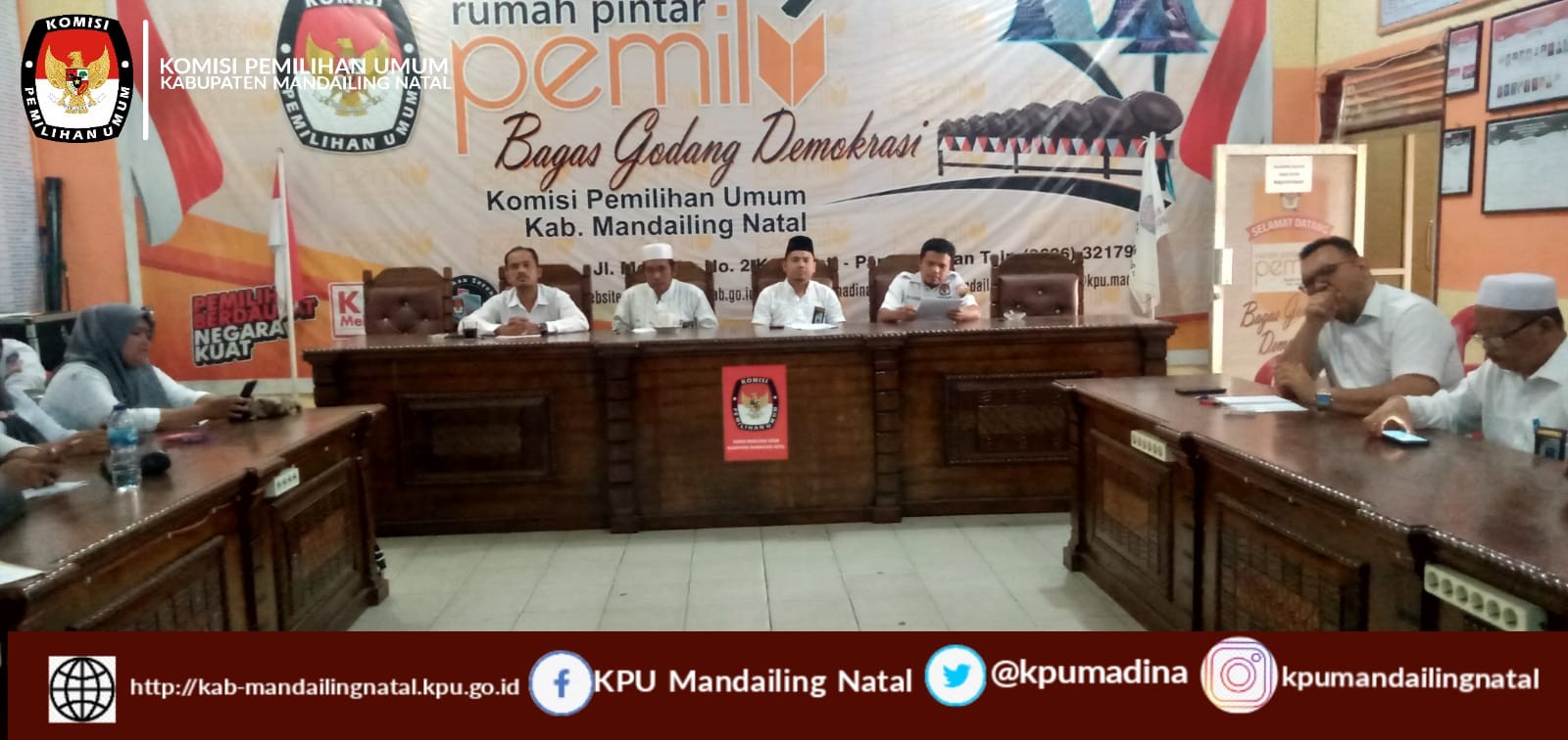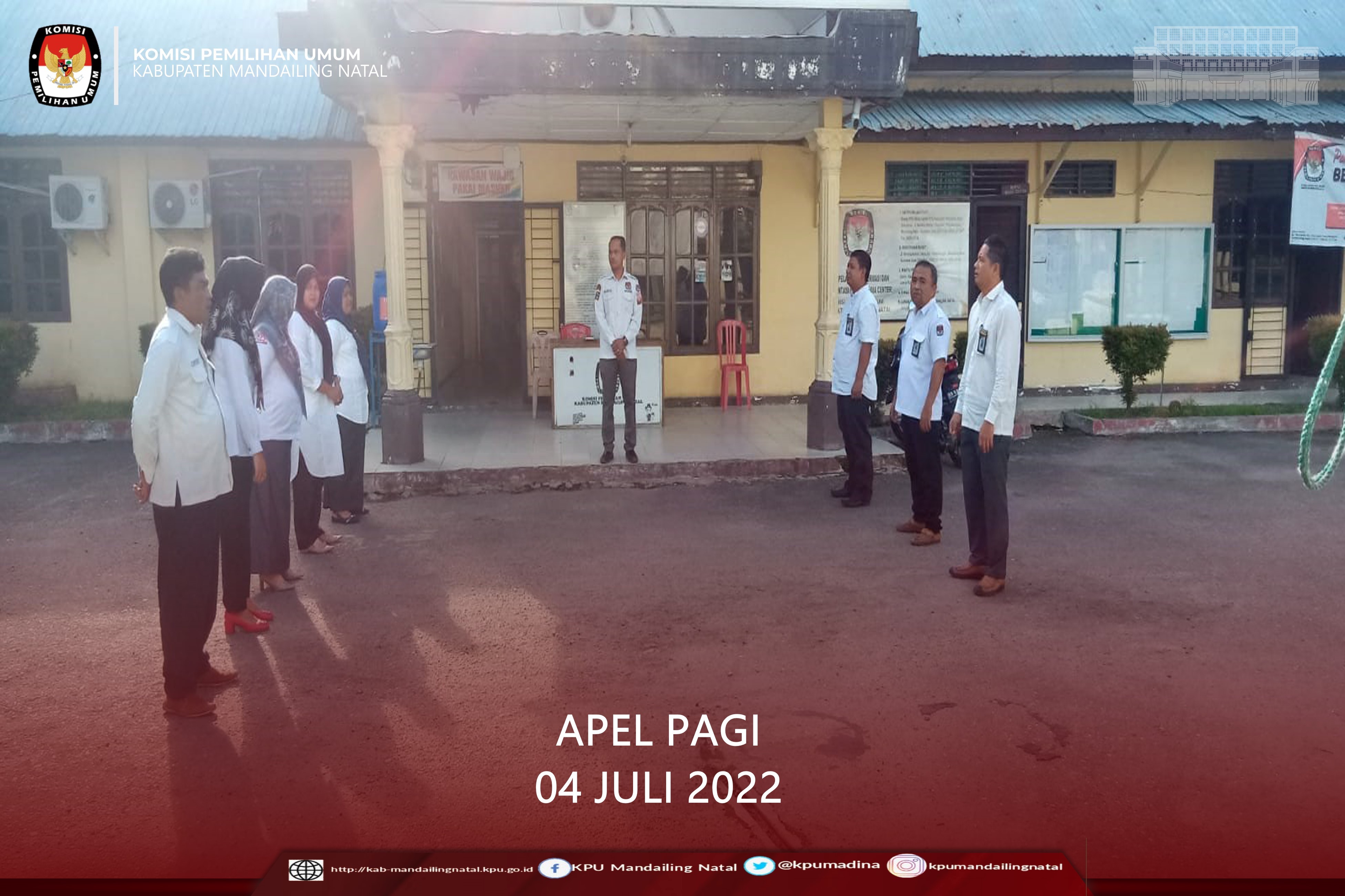 KPU Kabupaten Mandailing Natal, Senin tanggal Sebelas bulan Juli tahun Dua Ribu Dua Puluh Dua melaksanakan Apel Pagi di halaman Kantor Komisi Pemilihan Umum Kabupaten Mandailing Natal Jalan Merdeka No 2 Kayu Jati Panyabungan, Apel Pagi di Pimpin oleh Komisioner KPU Divisi Sosdiklih, SDM dan Parmasy” Bapak Muhammad Husein Lubis. Muhammad Husein dalam arahannya menyampaikan, Tahapan Pemilu sudah dimulai, terkait Persiapan Pelaksanaan Penerimaan Pendaftaran dan Verifikasi Partai Politik akan dilaksanakan tanggal 29 Juli sampai dengan 13 Desember 2022 ia menghimbau kepada Sekretariat KPU Kabupaten Mandailing Natal sebagai Penyelenggara Pemilu dalam menjalankan tugas dan kewajibannya harus dengan penuh tanggung jawab. Muhammad Husein juga mengharapkan kepada seluruh Sekretariat KPU Kabupaten Mandailing Natal agar tetap meningkatkan Kinerja dan Disiplin dalam menjalankan pekerjaan dan terus mengoptimalkan waktu dalam mensosialisasikan Aplikasi Lindungi Hakmu yang dapat di download oleh pengguna melalui Playstore yang ada diperangkat ponsel masing-masing, Fasilitas aplikasi Lindungi Hakmu Mobile ini merupakan bentuk transparansi aplikasi data pemilih. Oleh karena itu, bagi masyarakat yang ingin melakukan pengecekan data silahkan cek Aplikasi Lindungi Hakmu agar bisa mengecek apakah sudah terdaftar sebagai pemilih atau belum. Selesai Apel Pagi dilanjutkan dengan Rapat Rutin yang dihadiri oleh Ketua dan Anggota KPU Kabupaten Mandailing Natal, Sekretaris KPU Kabupaten Mandailing Natal, Para Kasubbag dan para staf di Jajaran Sekretariat KPU Kabupaten Mandailing Natal, Setelah rapat dilaksanakan, maka peserta rapat sepakat dan menyetujui untuk mempersiapkan rencana kegiatan berikutnya antara lain: Divisi Perencanaan Data dan Informasi; Menindaklanjuti Surat Edaran Komisi Pemilihan Umum Republik Indonesia Nomor 17 Tahun 2022 tentang Tindaklanjut Hasil Pemadanan Data Pemilih Berkelanjutan Semester II Tahun 2021 Komisi Pemilihan Umum dengan Data Kependudukan Kementerian Dalam Negeri Republik Indonesia; Menindaklanjuti Data yang disampaikan oleh Lapas Kelas IIb Panyabungan terkait Data Warga Binaan. Divisi Teknis Penyelenggaraan Pemilu; - Memantau Perkembangan Persiapan Pemilu/Pemilihan Tahun 2024 pada Situs Resmi KPU Republik Indonesia dan Group Media Sosial Divisi Teknis KPU; - Persiapan Pelaksanaan Penerimaan Pendaftaran dan Verifikasi Peserta Pemilu dan Penetapan Partai Politik Peserta Pemilu Anggota Dewan Perwakilan Rakyat Dan Anggota Dewan Perwakilan Rakyat Daerah sesuai Tahapan akan dilaksanakan pada tanggal 29 Juli 2022 sampai dengan 13 Desember 2022. Divisi Hukum dan Pengawasan; - Menyusun Draft Final MoU KPU Mandailing Natal dan Kajari Mandailing Natal dan Koordinasi dengan Kajari Mandailing Natal dalam rangka penandatanganan MoU ; - Penandatanganan MoU KPU Mandailing Natal dan Kajari Mandailing Natal pada hari selasa tanggal 12 Juli 2022; - Diskusi tentang PKPU Nomor 1 Tahun 2022 tentang Tata Cara Pembentukan Peraturan dan Keputusan di lingkungan Komisi Pemilihan Umum. Divisi Sosdiklih, Parmasy dan SDM - Melaksanakan Sosialisasi Persiapan Pemilu ke Pasar-pasar; - Mensupervisi Proses Input Data pada Aplikasi SIMPEG oleh PPNPN KPU Kabupaten Mandailing Natal (paling lambat tanggal 18 juli 2022). Divisi Keuangan, Umum dan Logistik; - Melakukan Koordinasi ke KPU Provinsi Sumatera Utara terkait tata cara Pelelangan Formulir Pemilu dan Pemilihan pada Satker KPU Kabupaten Mandailing Natal.