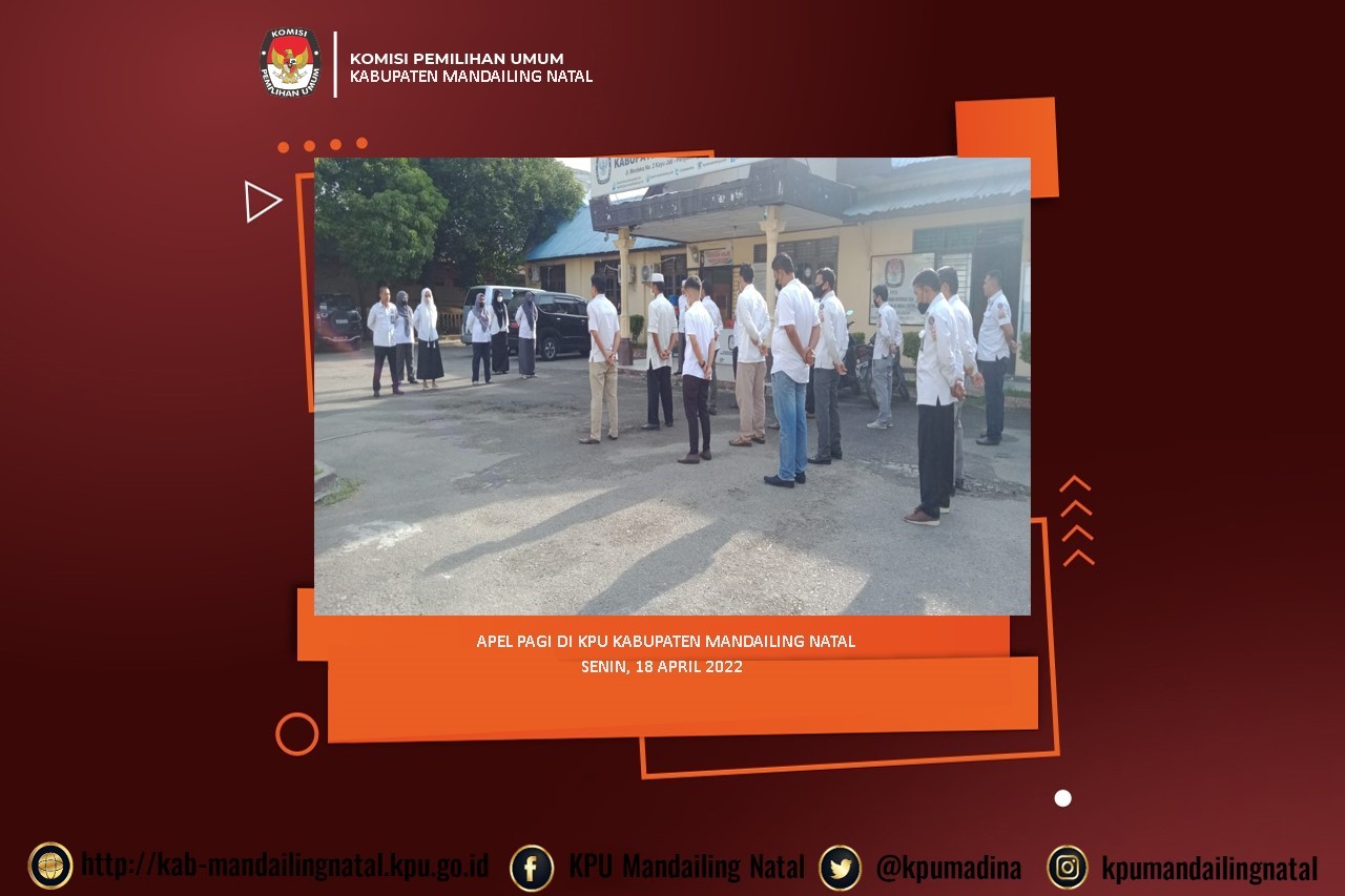 Panyabungan - Komisi Pemilihan Umum Kabupaten Mandailing Natal Senin tanggal Delapan Belas bulan April tahun Dua Ribu Dua Puluh Dua melaksanakan Apel Pagi di halaman Kantor Komisi Pemilihan Umum Kabupaten Mandailing Natal Jalan Merdeka No 2 Kayu Jati Panyabungan, Apel Pagi di Pimpin oleh Ketua Divisi Perencanaan, Data dan Informasi “Akhir Mada”