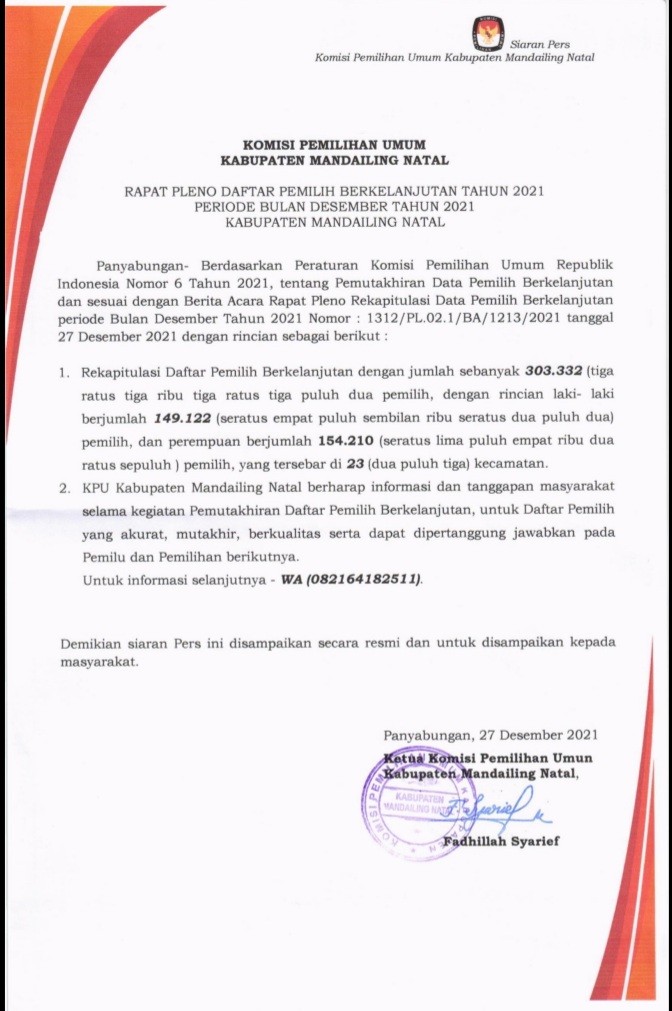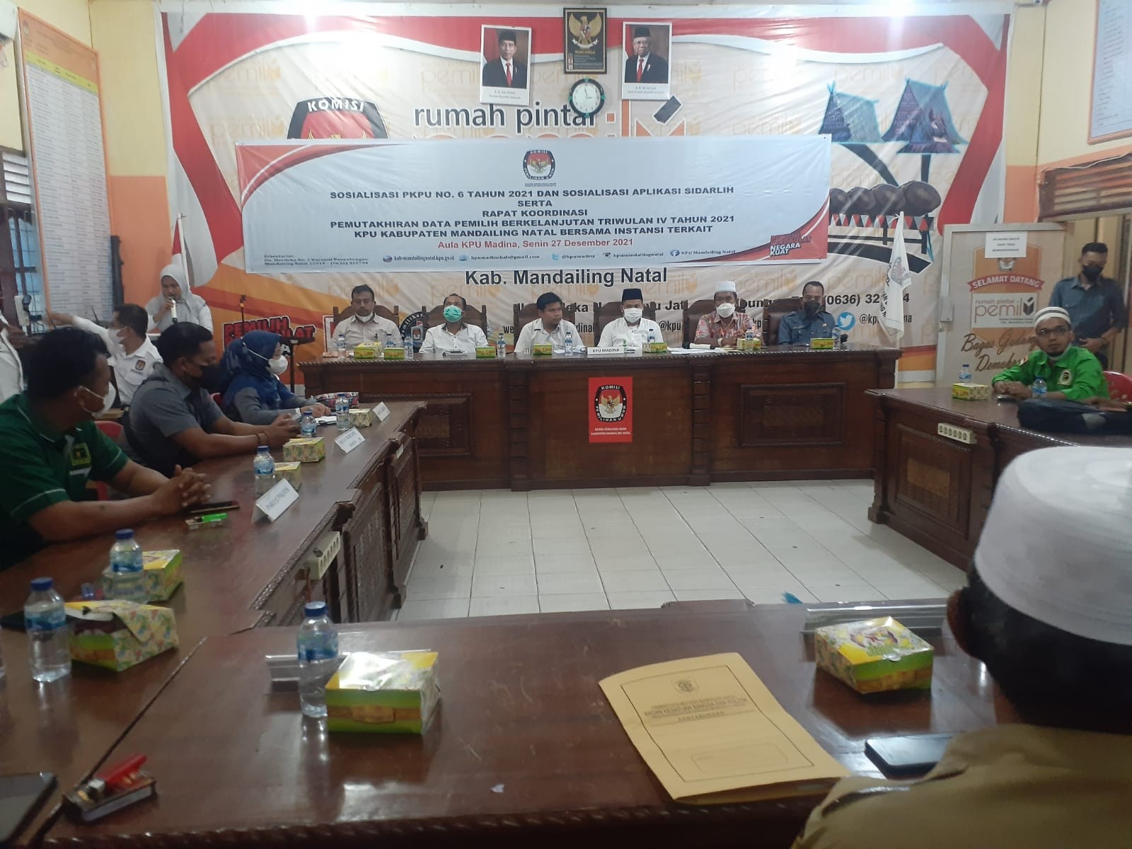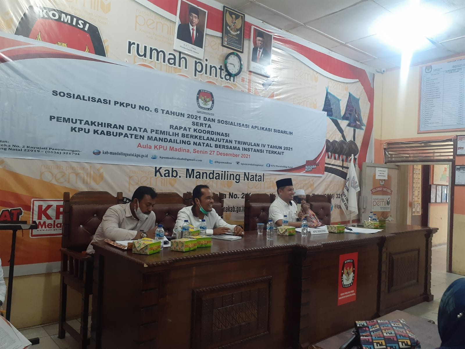 Senin 27 Desember 2021. Komisi Pemilihan Umum Kabupaten Mandailing Natal Melaksanakan Rapat Koordinasi Pemutakhiran Data Pemilih Berkelanjutan Triwulan IV Tahun 2021. Bertempat di Aula KPU Mandailing Natal. Acara rakor tersebut di buka langsung oleh Ketua KPU Kabupaten Mandailing Natal yang di hadiri oleh Komisioner KPU, Ketua Bawaslu beserta Anggota, Polres Madina,Dandim0212/TS,Disdukcapil,Kesbangpol, Cabdis sidimpuan dan beberapa partai Politik seperti Gerindra,PDIP,Golkar,PPP dan Partai Hanura..
