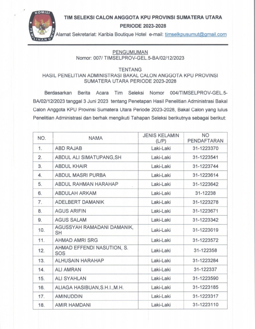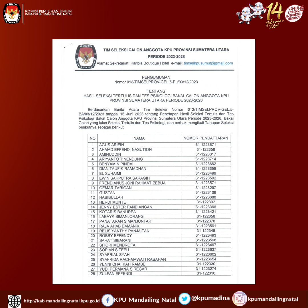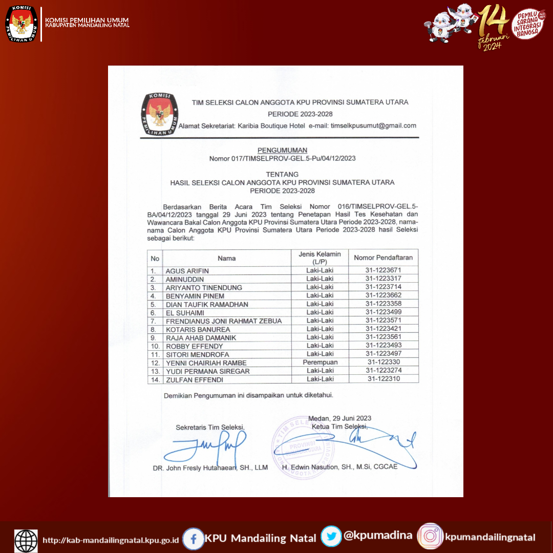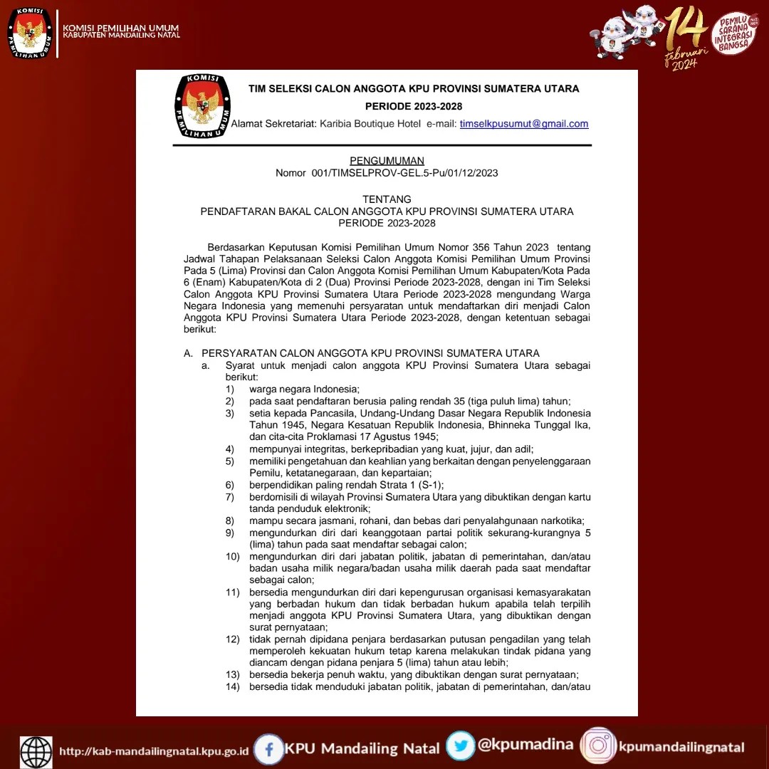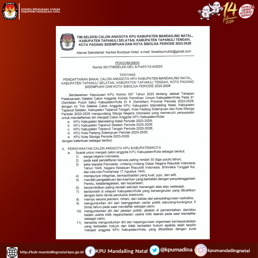 Berikut Kami sampaikan PENGUMUMAN Nomor 001/TIMSELKK-GEL.6-Pu/01/12-4/2023 Tentang Pendaftaran Bakal Calon Anggota KPU Kabupaten Mandailing Natal, Kabupaten Tapanuli Selatan, Kabupaten Tapanuli Tengah, Kota Padangsidimpuan dan Kota Sibolga Periode 2023-2028.