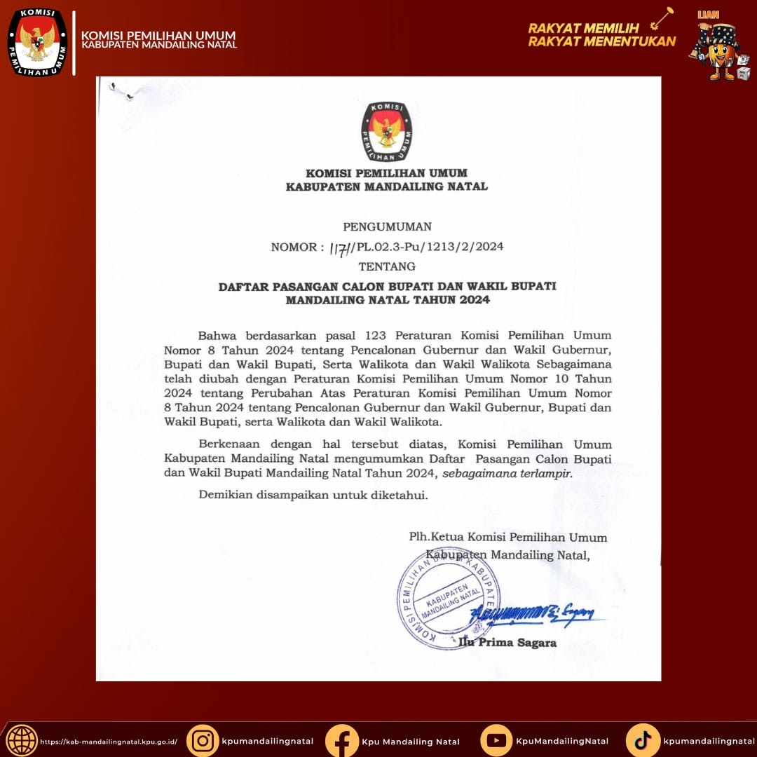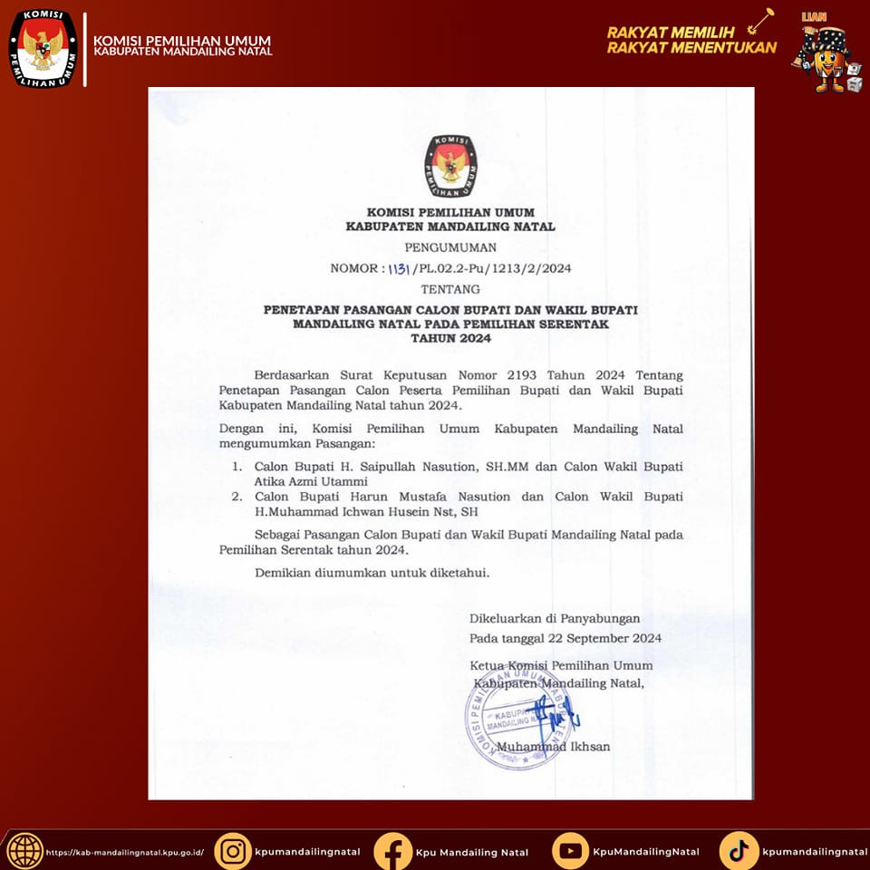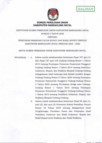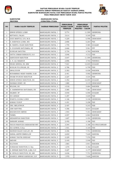 BERIKUT KAMI TAMPILKAN DAFTAR PEROLEHAN SUARA CALON TERPILIH ANGGOTA DEWAN PERWAKILAN RAKYAT DAERAH (DPRD) KABUPATEN MANDAILING NATAL DAN PEROLEHAN SUARA PARTAI POLITIK PADA PEMILIHAN UMUM TAHUN 2024