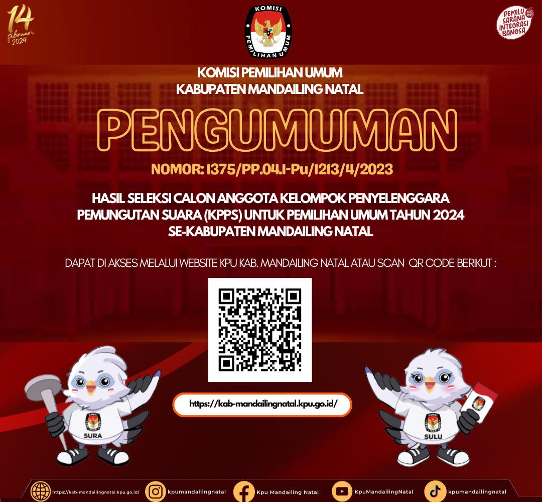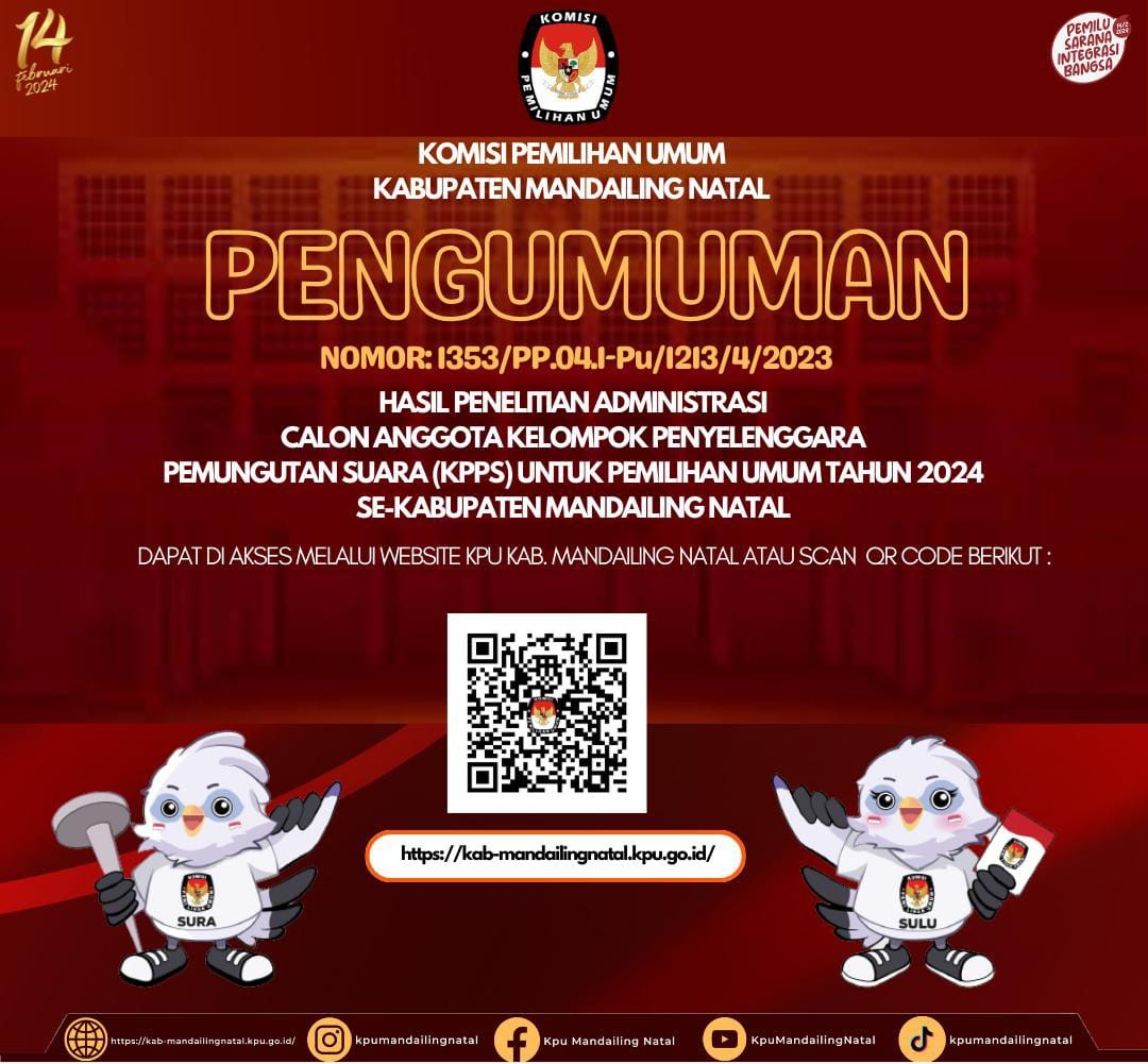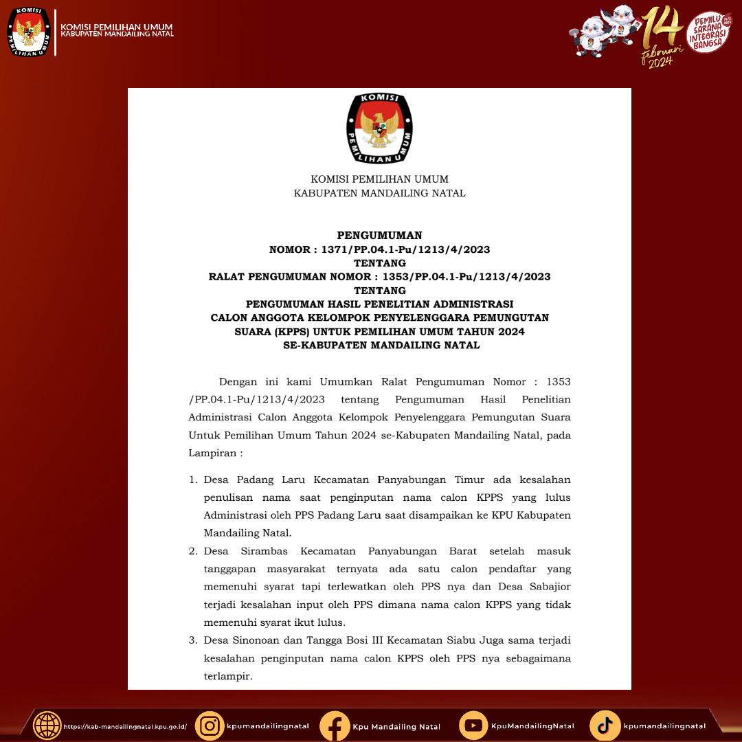 Berikut kami sampaikan Pengumuman Nomor 1371/PP.04.1-Pu/1213/4/2023 tentang Ralat Pengumuman Nomor 1353/PP.04.1-Pu/1213/4/2023 tentang Pengumuman Hasil Seleksi Administrasi Calon Anggota Kelompok Penyelenggara Pemungutan Suara (KPPS) untuk Pemilihan Umum Tahun 2024 se-Kabupaten Mandailing Natal.