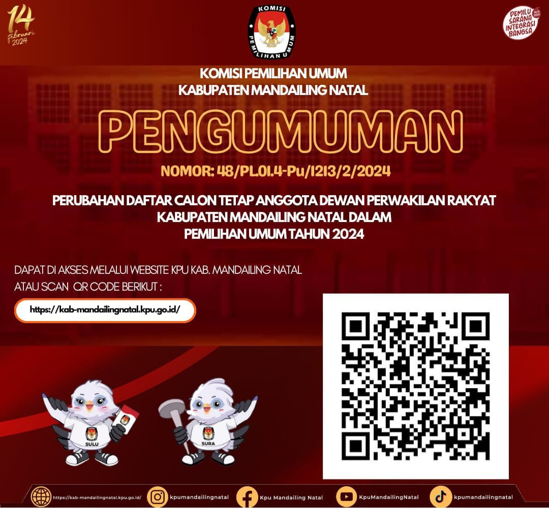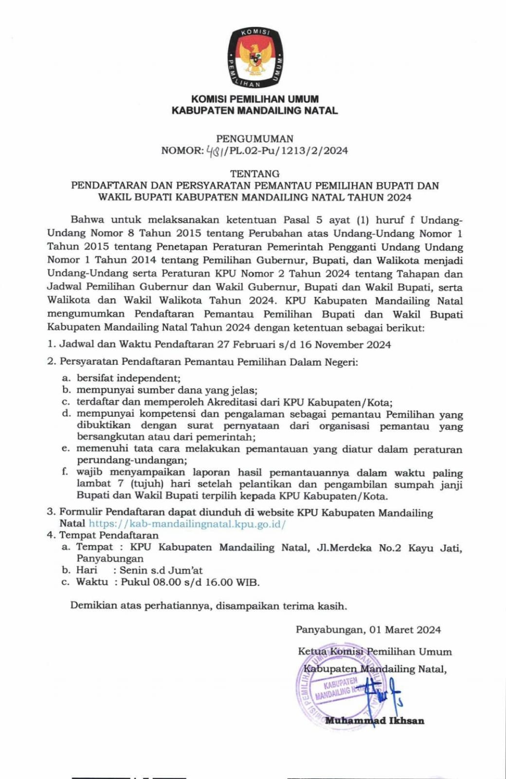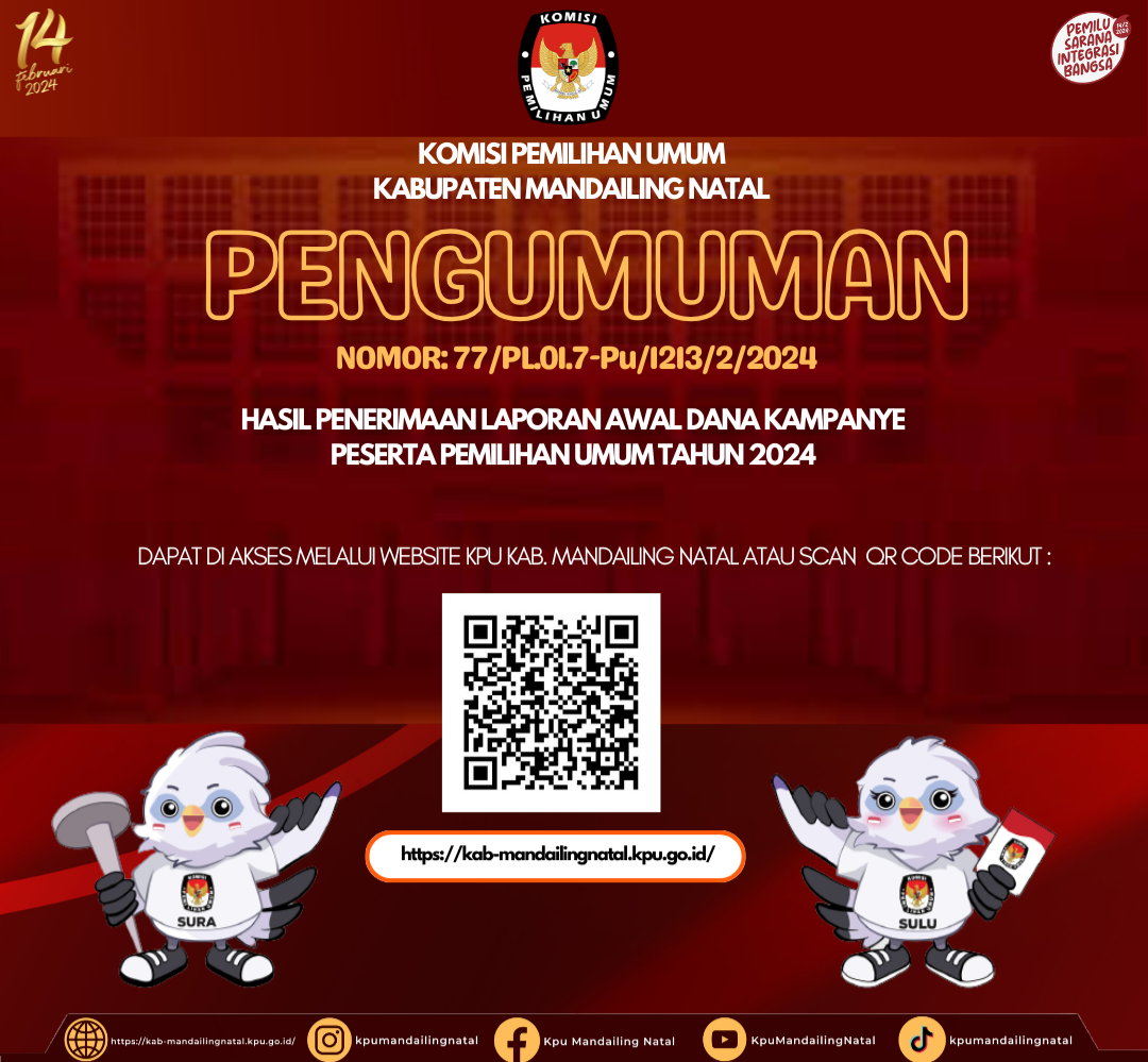 Berikut kami sampaikan Pengumuman Nomor 1371/PP.04.1-Pu/1213/4/2023 tentang Ralat Pengumuman Nomor 1353/PP.04.1-Pu/1213/4/2023 tentang Pengumuman Hasil Seleksi Administrasi Calon Anggota Kelompok Penyelenggara Pemungutan Suara (KPPS) untuk Pemilihan Umum Tahun 2024 se-Kabupaten Mandailing Natal.