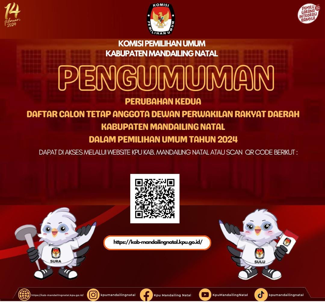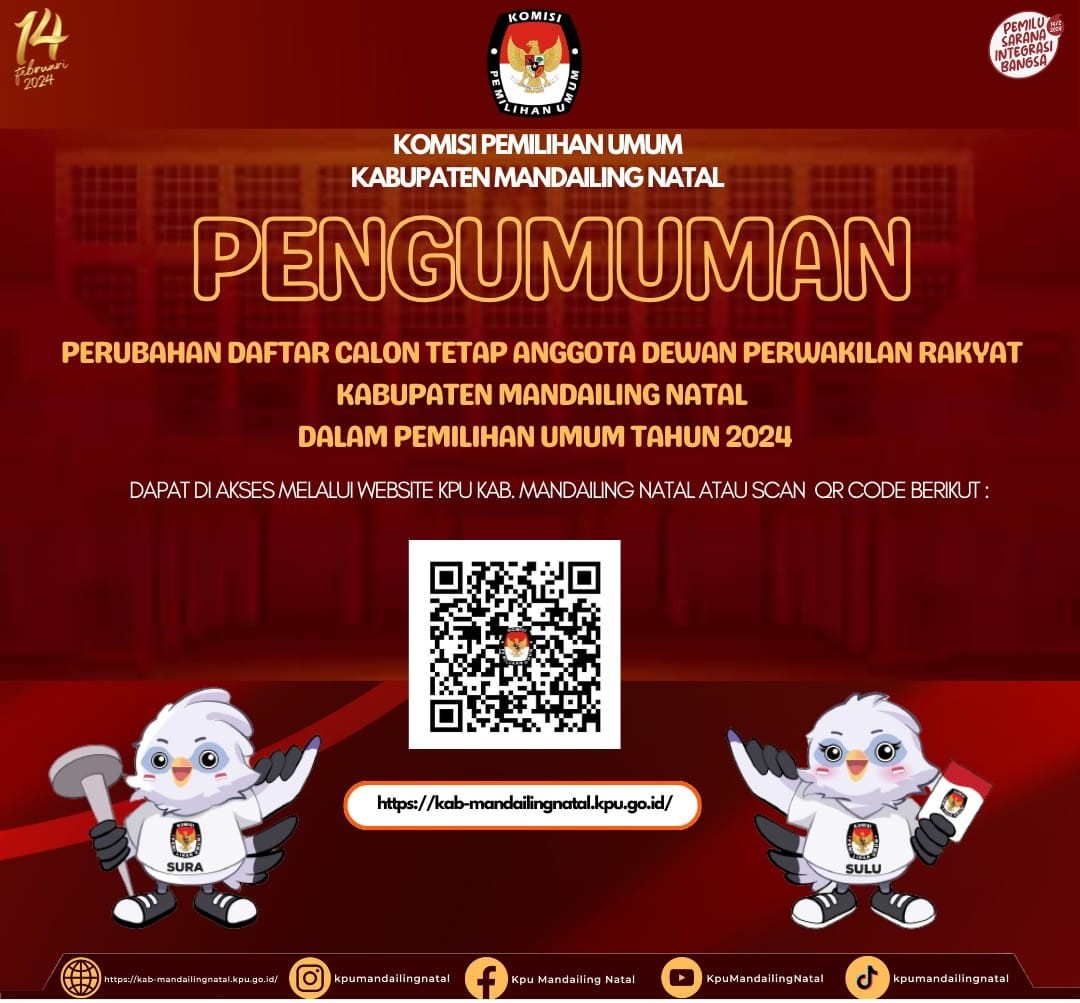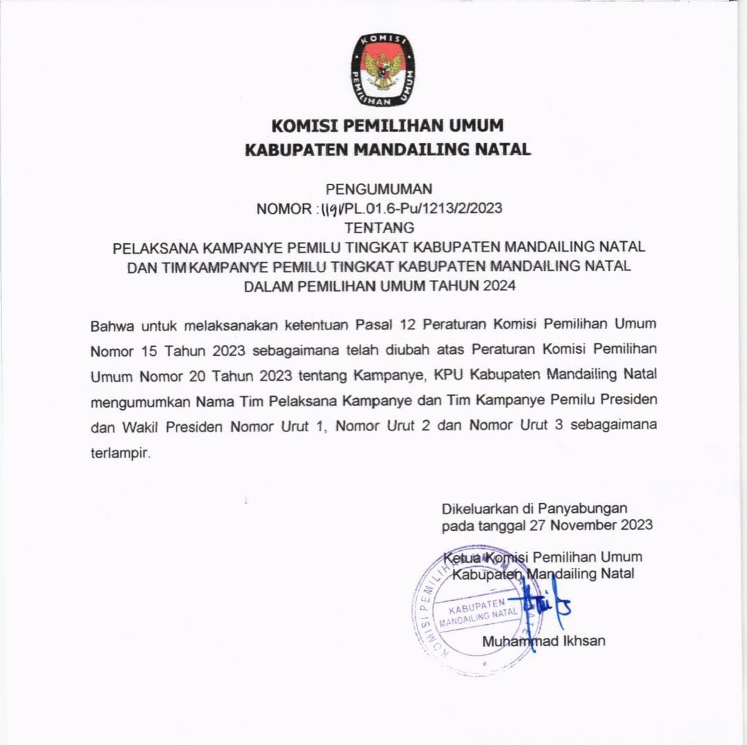 BERIKUT KAMI SAMPAIKAN PENGUMUMAN NOMOR :1191/PL.01.6-Pu/1213/2/2023 TENTANG PELAKSANA KAMPANYE PEMILU TINGKAT KABUPATEN MANDAILING NATAL DAN TIM KAMPANYE PEMILU TINGKAT KABUPATEN MANDAILING NATAL UNTUK PRESIDEN DAN WAKIL PRESIDEN DALAM PEMILIHAN UMUM TAHUN 2024.