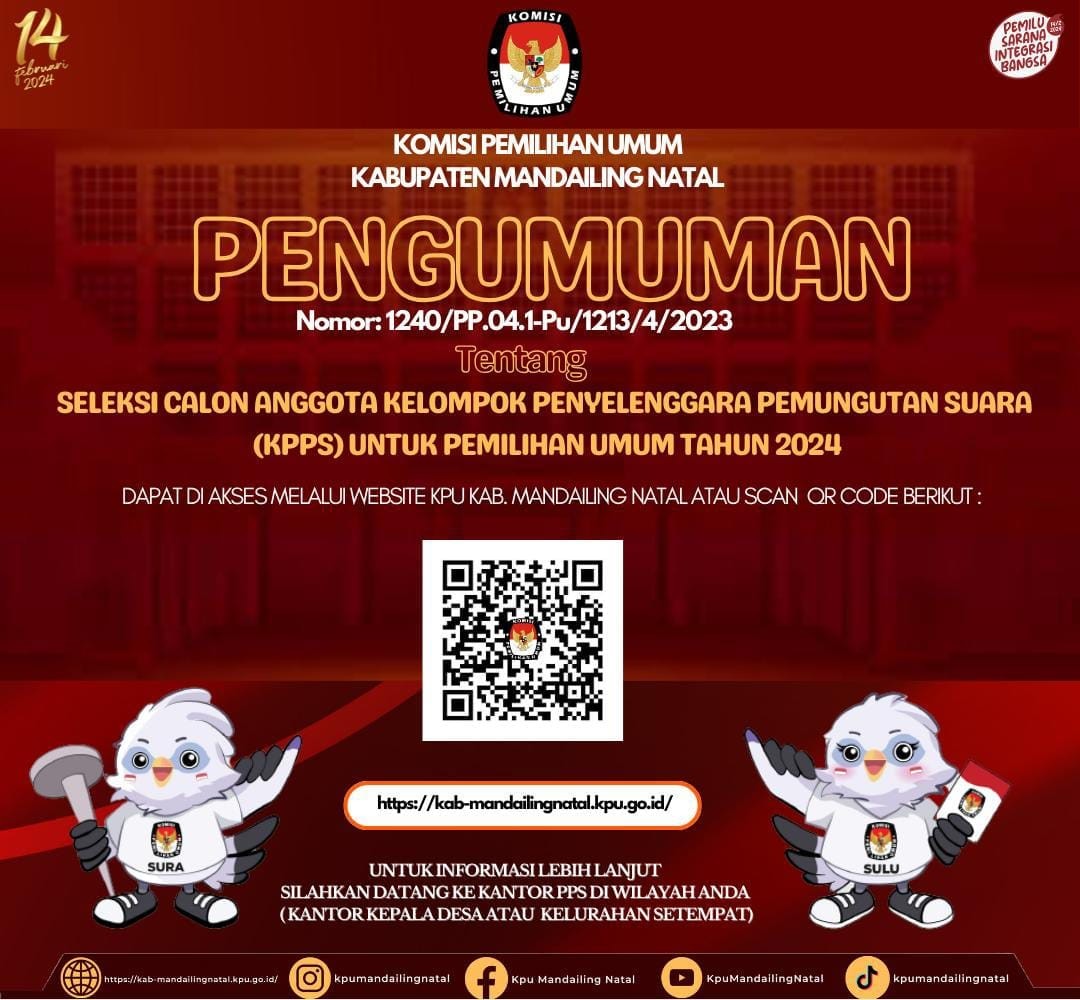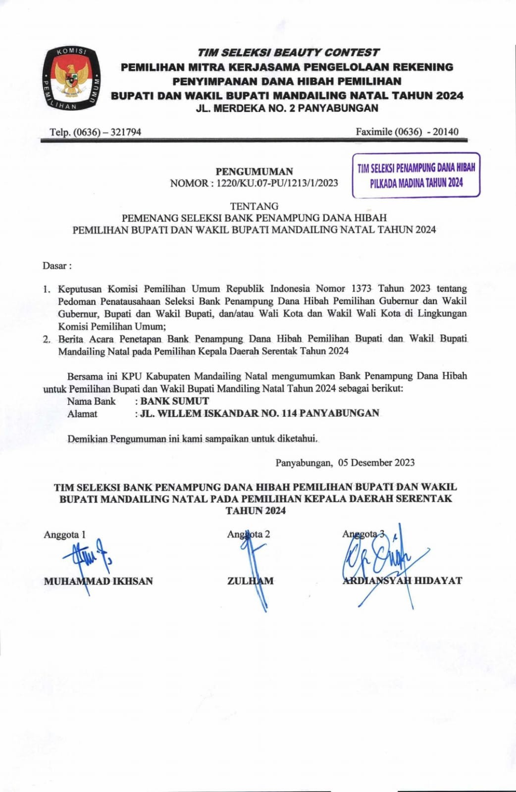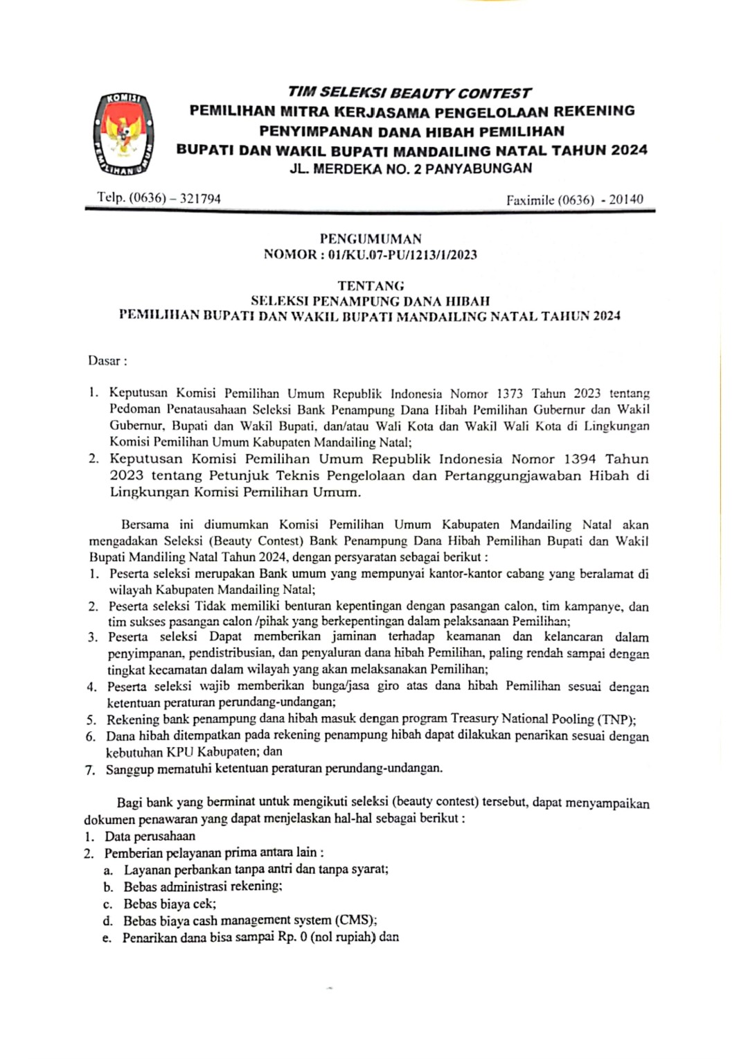 BERIKUT KAMI SAMPAIKAN PENGUMUMAN NOMOR :1191/PL.01.6-Pu/1213/2/2023 TENTANG PELAKSANA KAMPANYE PEMILU TINGKAT KABUPATEN MANDAILING NATAL DAN TIM KAMPANYE PEMILU TINGKAT KABUPATEN MANDAILING NATAL UNTUK PRESIDEN DAN WAKIL PRESIDEN DALAM PEMILIHAN UMUM TAHUN 2024.