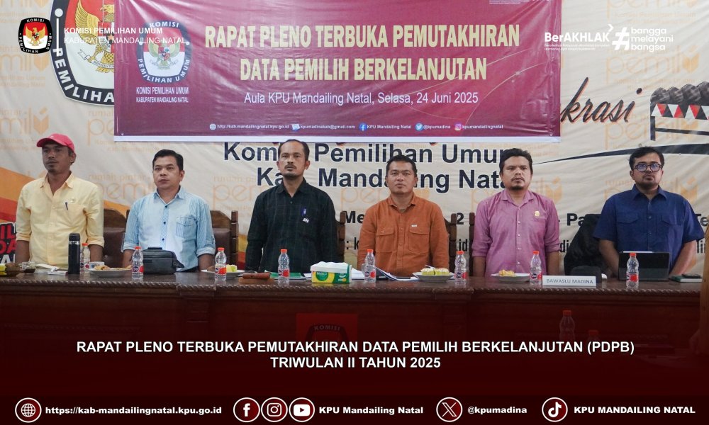 KPU Kabupaten Mandailing Natal melaksanakan Rapat Pleno Terbuka Pemutakhiran Data Pemilih Berkelanjutan (PDPB) Triwulan II di Aula Kantor KPU Kabupaten Mandailing Natal. Selasa (24/06/2025) Acara yang dibuka langsung oleh Ketua KPU Kabupaten Mandailing Natal (Muhammad Ikhsan) didampingi Kadiv Hukum dan Pengawasan (Agus Salam), Kadiv Teknis Penyelenggara Pemilu (Muhammad Yasir Nasution), Kadiv Sosdiklih, Parmas dan SDM (Ilu Prima Sagara) dan Kadiv Perencanaan, Data dan Informasi (Muhammad Al-Khotib) bertujuan untuk memelihara dan memperbaharui DPT Pemilu dan/atau Pemilihan terakhir secara berkelanjutan dan untuk penyusunan DPT pada Pemilu dan/atau Pemilihan berikutnya dengan tetap menjamin kerahasiaan data. Dalam acara juga hadir Bawaslu Kabupaten Mandailing Natal (Bambang Saswanda) beserta jajaran staf sekretariat, Perwakilan dari Dinas Kependudukan dan Pencatatan Sipil Kabupaten Mandailing Natal dan juga Perwakilan dari Pimpinan Partai Politik tingkat Kabupaten Mandailing Natal. Diakhir acara, KPU Kabupaten Mandailing Natal menetapkan Rekapitulasi Daftar Pemilih Berkelanjutan Tingkat Kabupaten Mandailing Natal sebanyak 335.100 pemilih yang terdiri dari 165.528 pemilih laki-laki dan 169.572 pemilih perempuan.